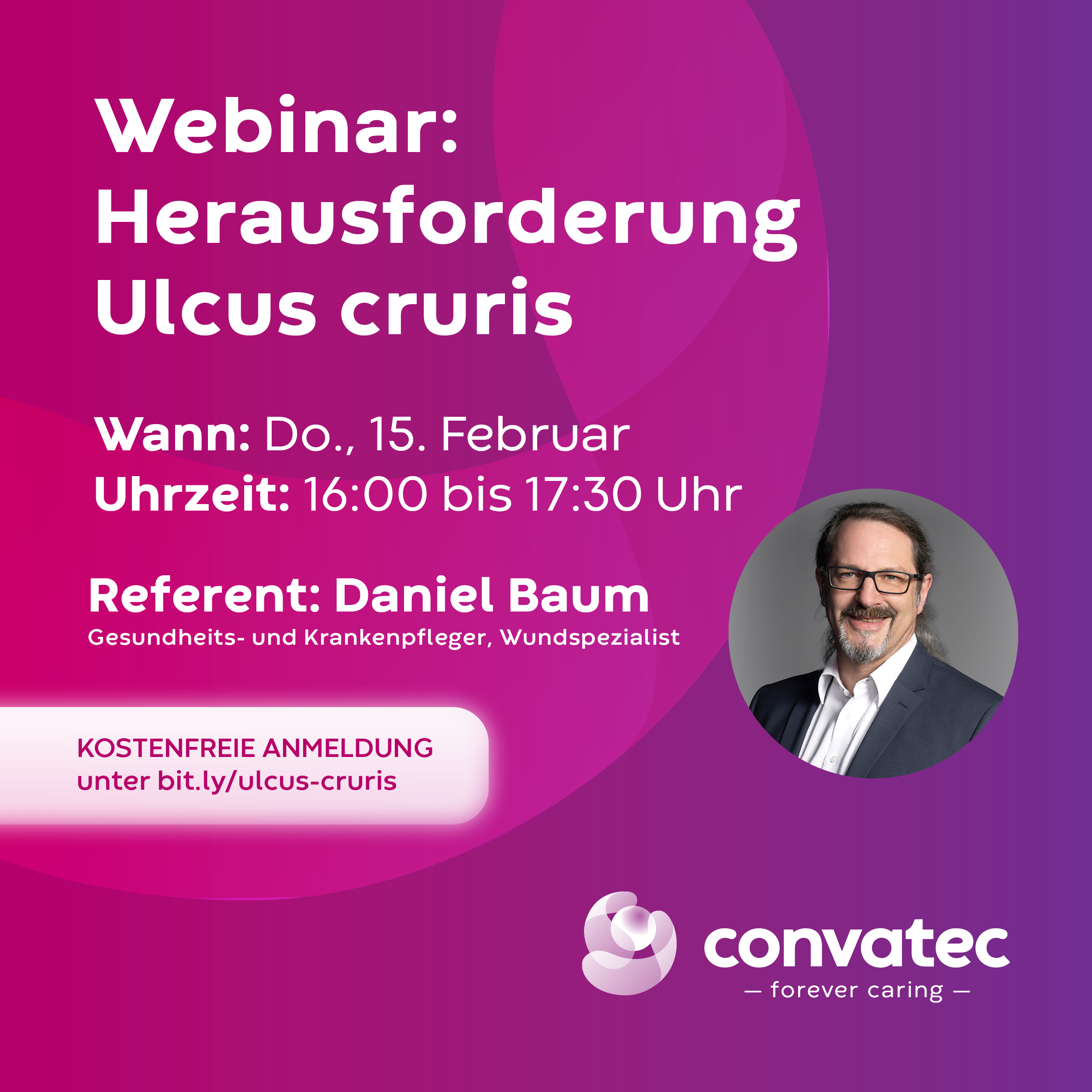 Mehr zu den Prinzipien einer hydroaktiven, phasengerechten Wundversorgung erfahren Sie im Online-Seminar „Herausforderung Ulcus cruris“ am 15. Februar 2024 von 16:00 bis 17:30 Uhr mit Wundexperte Daniel Baum.